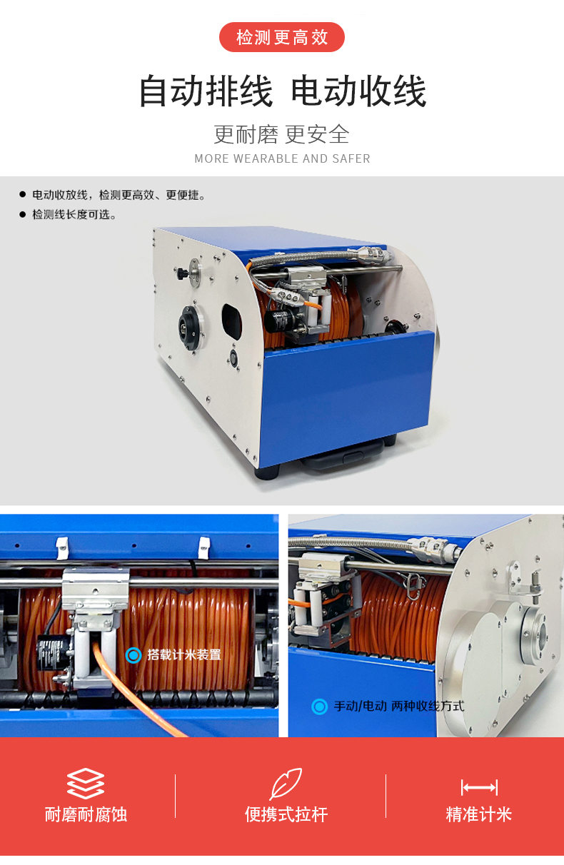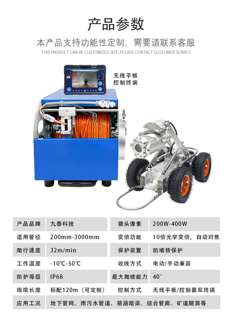 TR200PRO系列CCTV管道檢測機器人通過電纜與控制系統連接后,響應控制系統的操作命令。如:爬行器的前進、后退、轉向、停止、速度調節;鏡頭座的抬升、下降、燈光調節;鏡頭的旋轉、翻轉、調焦、變倍、前后視切換等。在檢測過程中,控制系統可實時顯示錄制鏡頭回傳的畫面以及爬行器的狀態信息。前置高清變倍攝像頭,支持自動對焦,200萬像素高清實時傳輸;IP68級超強防水,可用于10米水深,氣密保護,內置氣壓傳感器,有壓力指示燈。支持生成檢測報告,通過管道檢測信息管理系統,對檢測數據進行采集、上傳、存儲和分析等。